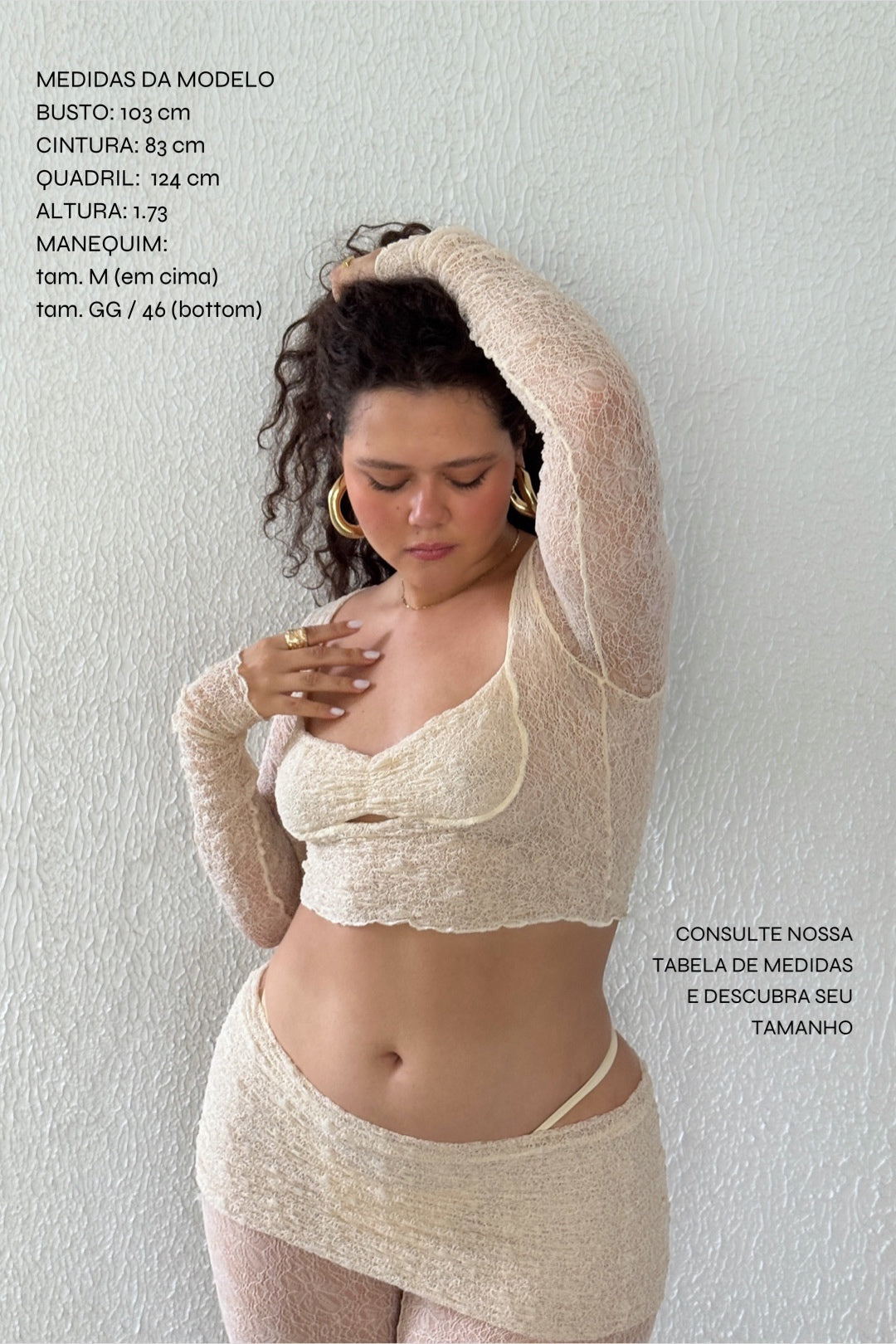 Pra estrear nossa temporada de verão escolhemos uma renda incrível na cor areia, super confortável e flexível (em mix de poliamida com elastano, em trama que entrega transparência). A Blusa Duna tem modelagem cropped, possui camada dupla no busto, e mangas longas.