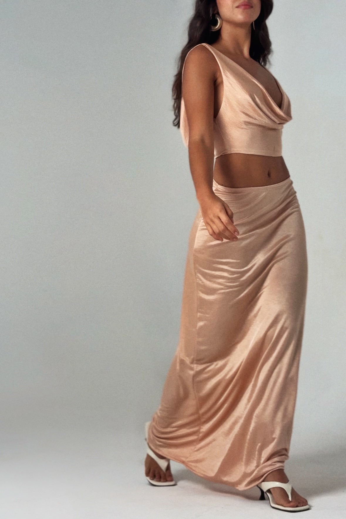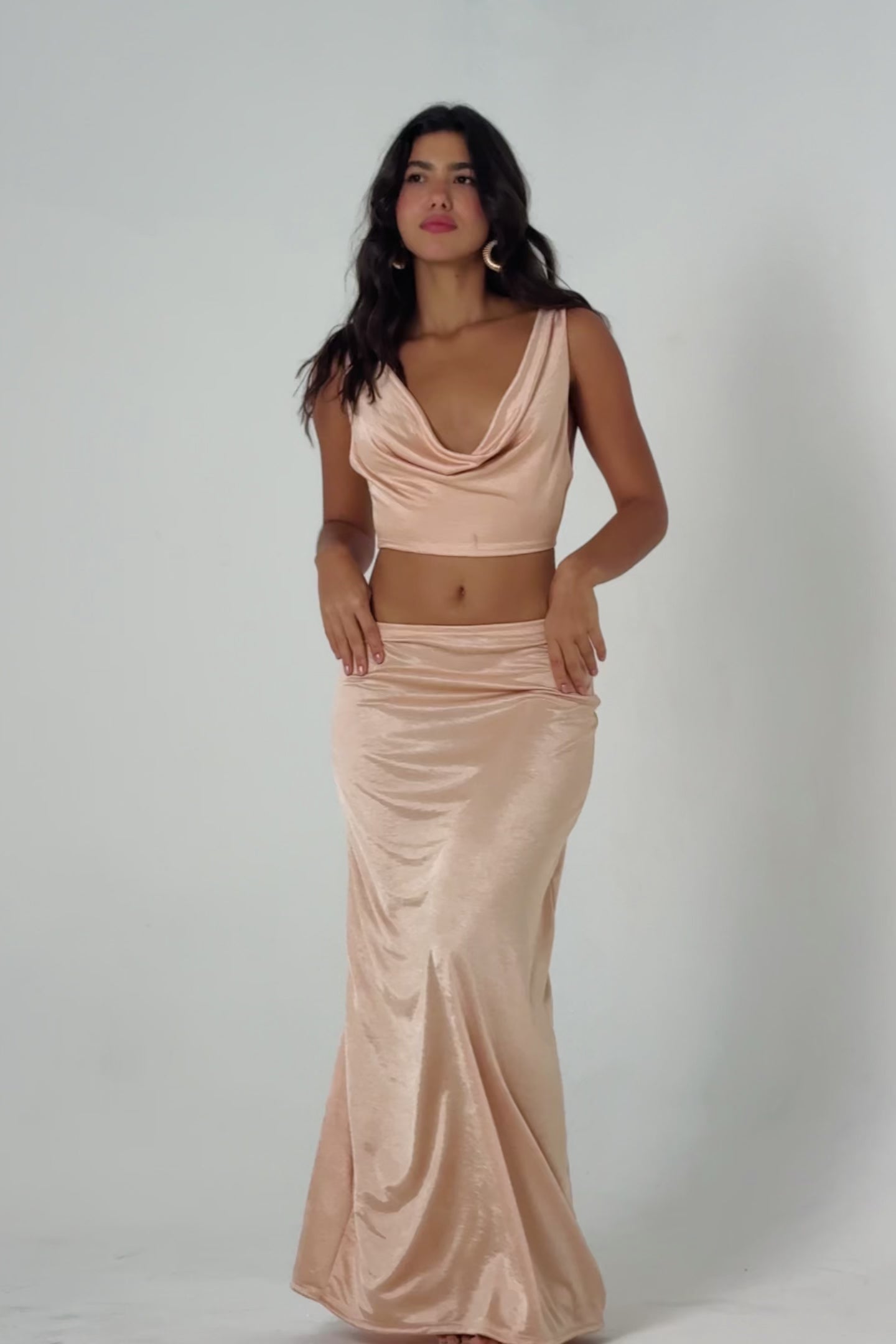 Aquela saia na cor peach jamais-básica que a gostosa precisa para as produções de verão. Possui elástico na cintura (pode ser usada alta ou baixa), corte reto e o tecido perfeito que entrega conforto e brilho. Use com Top Madá II, croppeds ou tees.