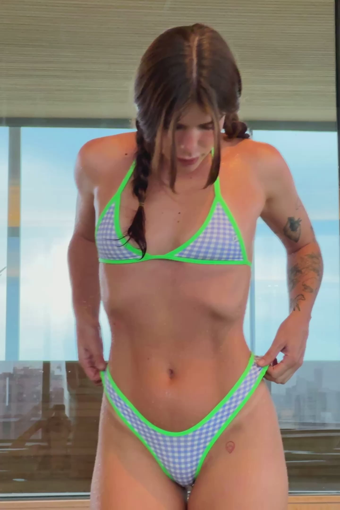 A gente precisava de uma asa delta com laterais mais largas, aquela energia retrô e que entregasse muito conforto. No mix da estampa vicky com viés neon green, ela possui camada dupla que não marca e não fica transparente, em poliamida tecnológica. Perfeita pra usar com o Top Mini e o Top Max do mesmo drop.